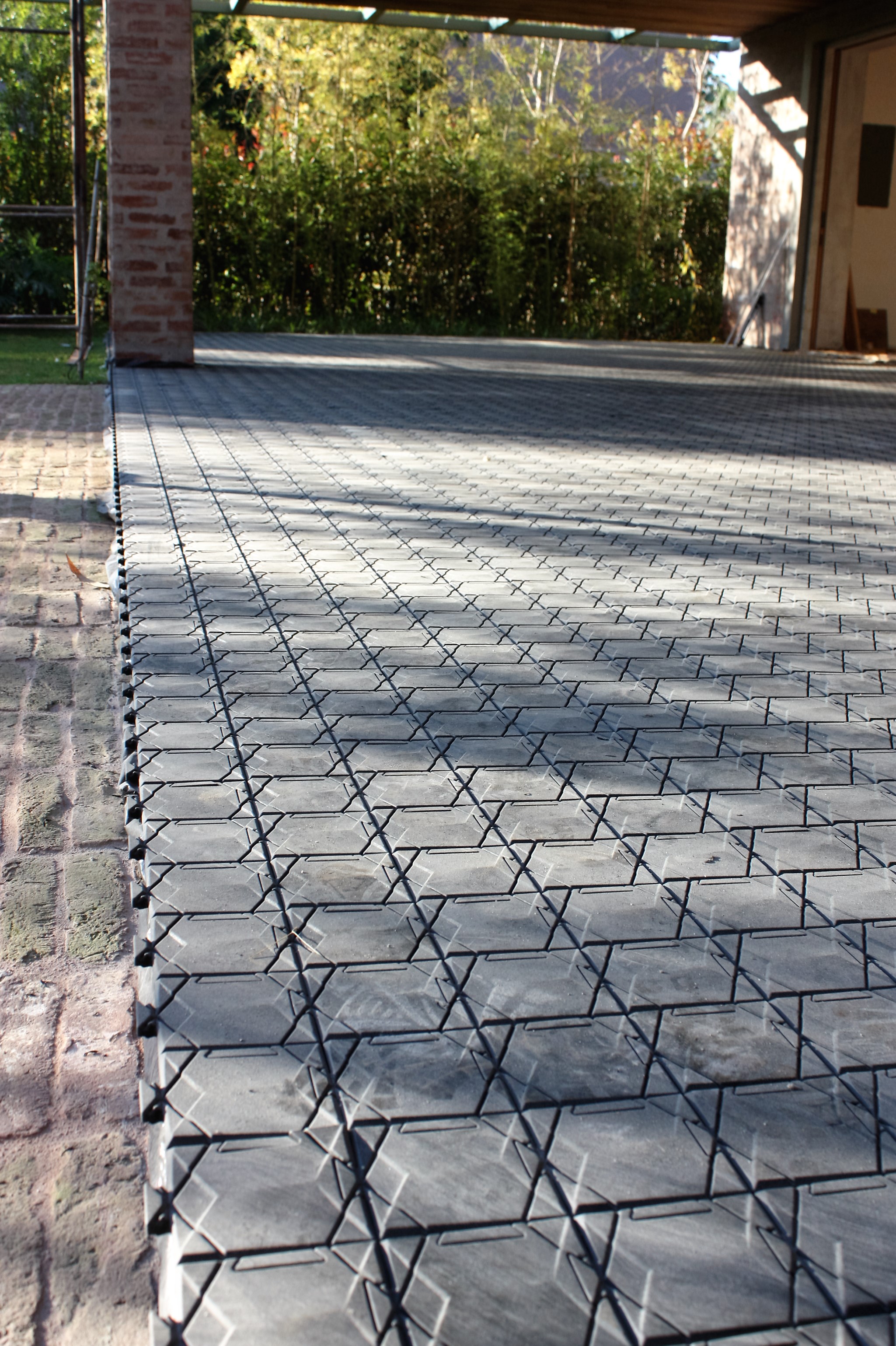 Não utiliza adesivo, a fixação ocorre pelo peso da peça e pela geometria intertravada.